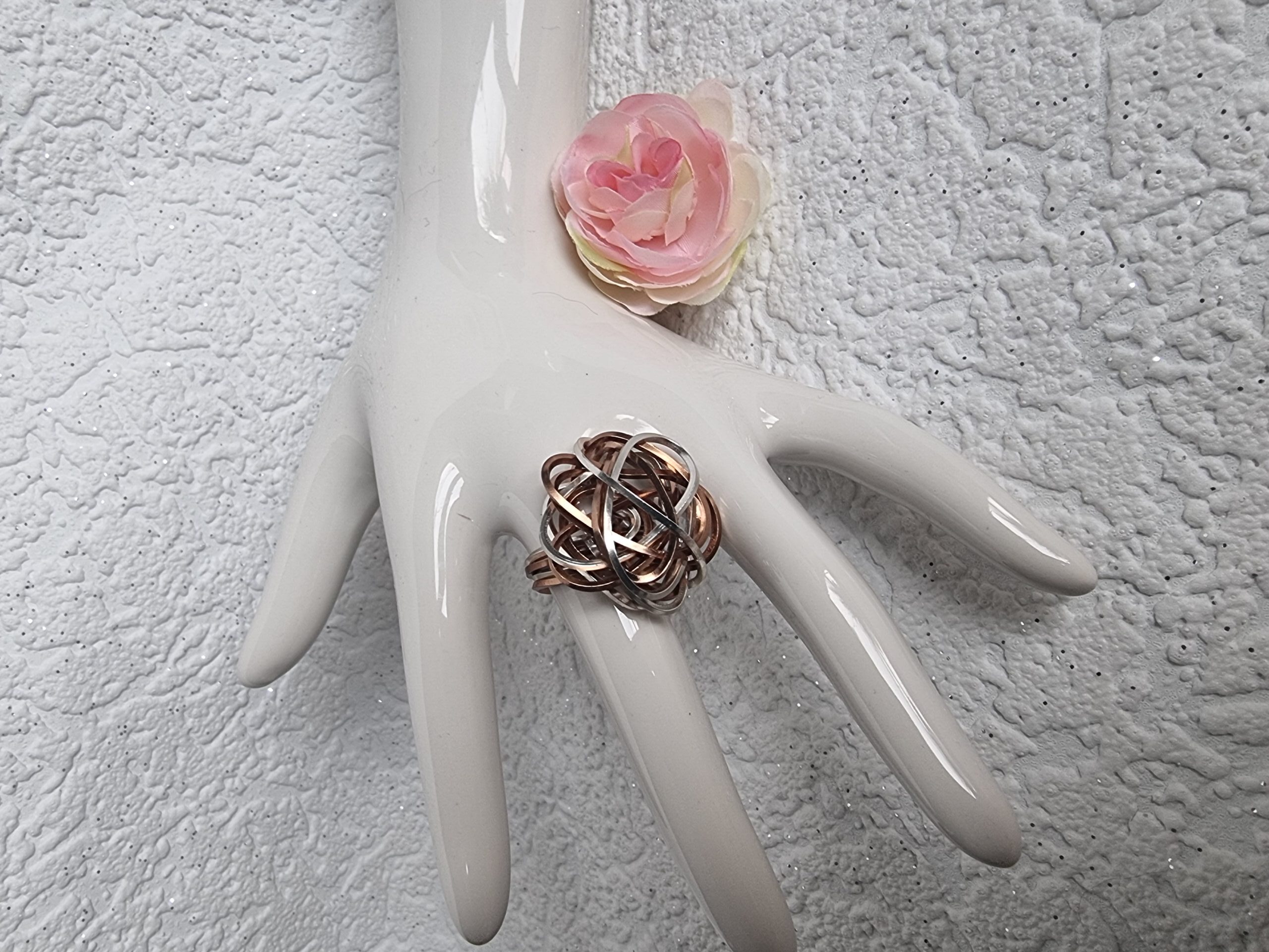 Ring Chaos cognac – champagner. Diesen Ring habe ich mit dem tollen Square-Wire-Draht ( Vierkantdraht) gearbeitet. Durchmesser ca. 2,7 cm