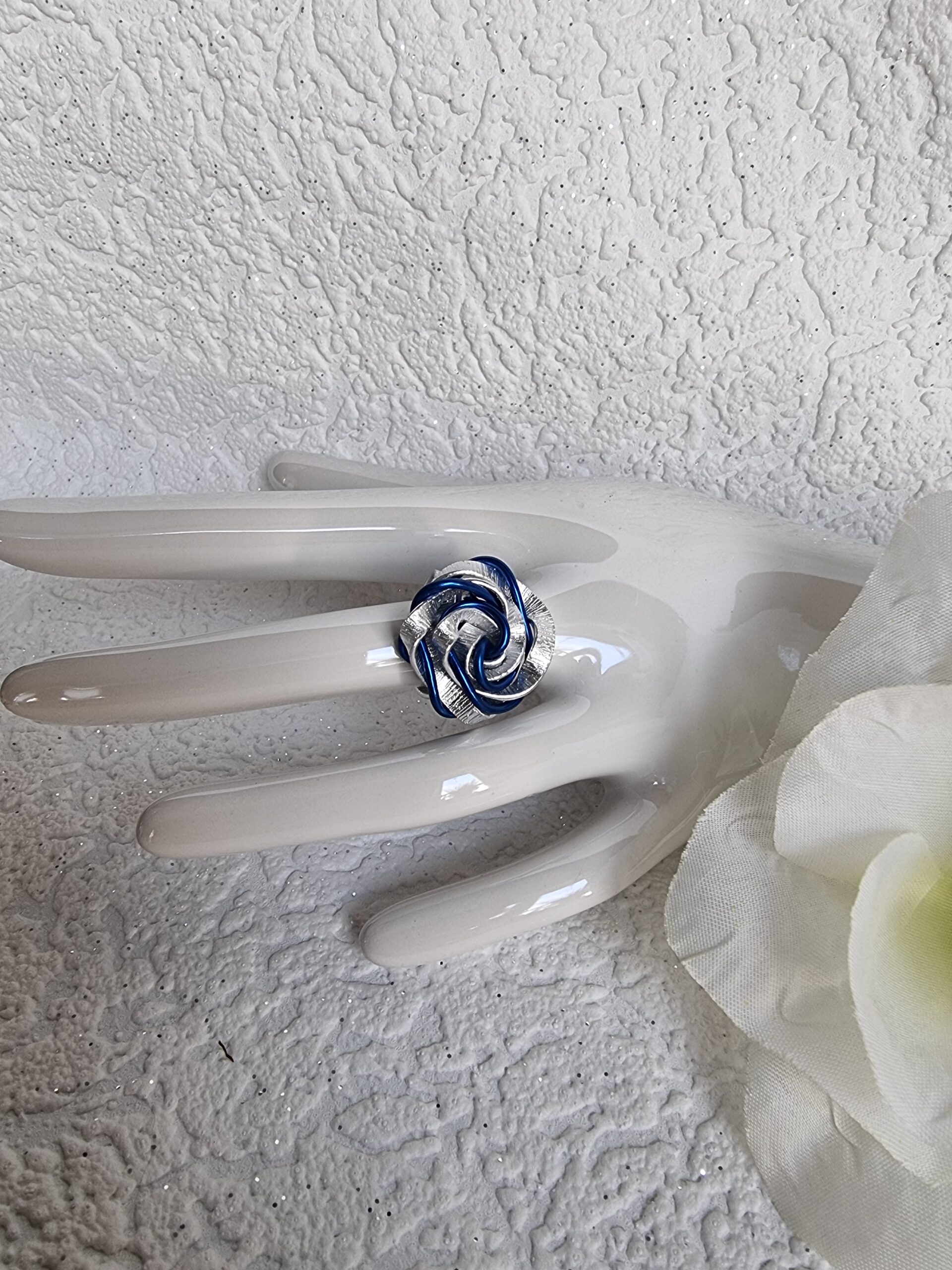 Ring Rose mit Flachdraht in silber – königsblau. Gearbeitet mit Flachdraht in silber geprägt und Runddraht in königsblau. Durchmesser ca. 2,5 cm.